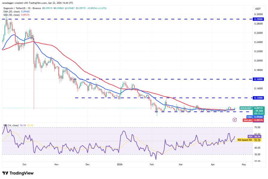 Time is running out for the bears. They will have to swiftly pull the price back below the $0.09 level to retain the advantage. If they do that, the DOGE/USDT pair may slump to the Feb. 6 low of $0.08.