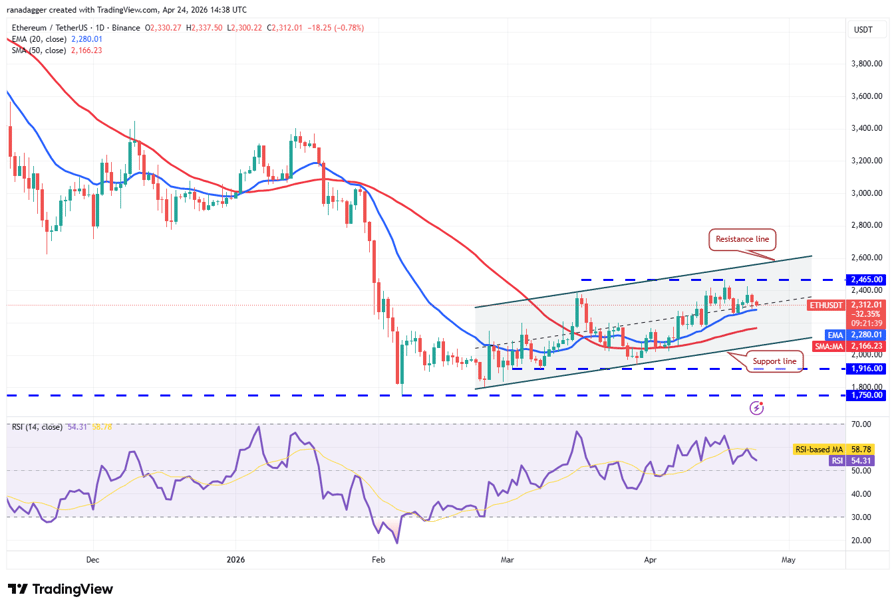 Ether (ETH) turned down from the $2,465 resistance on Wednesday and fell to the 20-day EMA ($2,280).