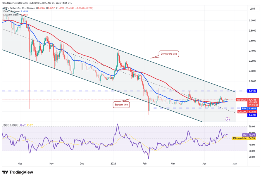Buyers have held XRP (XRP) above the moving averages but are struggling to push the price toward the downtrend line.