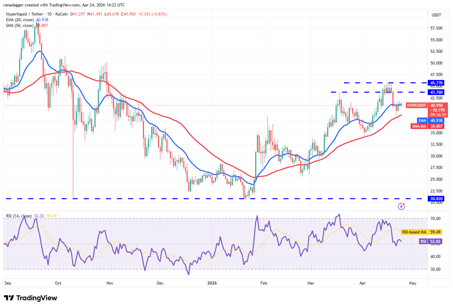 The flattening 20-day EMA and the RSI just above the midpoint signal a balance between supply and demand. If the HYPE price rises and maintains above $42, the bulls will endeavor to clear the $45.77 hurdle. If they can pull it off, the HYPE/USDT pair may surge to $50.