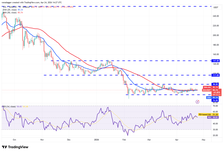 The flattish moving averages and the RSI near the midpoint suggest that the SOL/USDT pair may remain inside the $76 to $98 range for some more time.