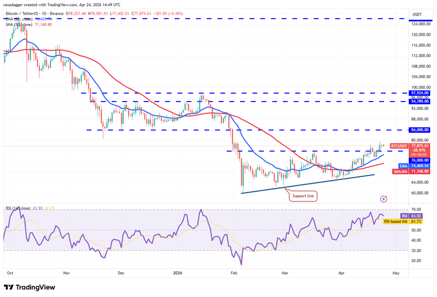 That suggests the bears have not given up and continue to sell on rallies. The 20-day exponential moving average ($74,469) is the crucial support to watch out for on the downside. If the price rebounds off the 20-day EMA, the bulls will again attempt to thrust the BTC/USDT pair toward the $84,000 level.