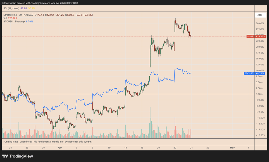 MSTR vs. BTC/USD one-month price performance. Source: TradingView