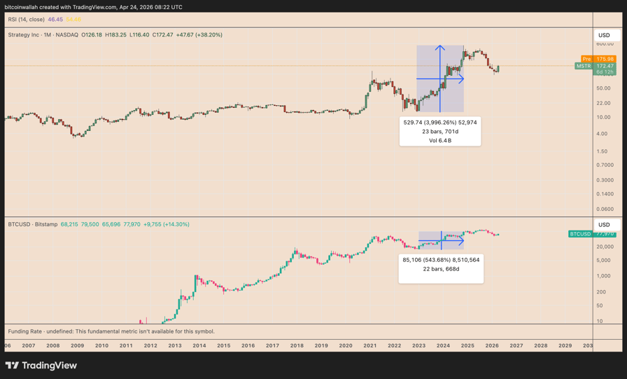 MSTR has often risen two to three times more than BTC during bull cycles. In the 2022-2024 bull market, for instance, MSTR rose by around 4,000% versus Bitcoin’s 550% gain.