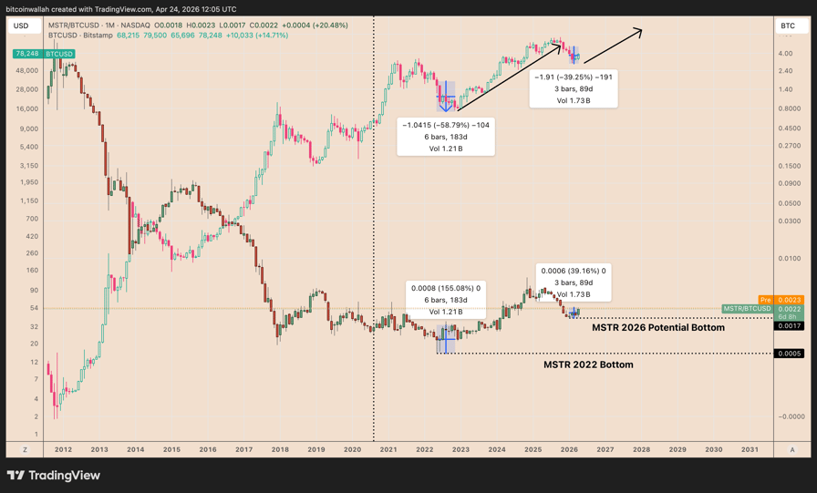 In 2022, for instance, the MSTR/BTC ratio rose 155% in the six months after bottoming in May, even as Bitcoin fell another 58.8%. BTC finally bottomed in November 2022, while MSTR was already in its outperformance phase.