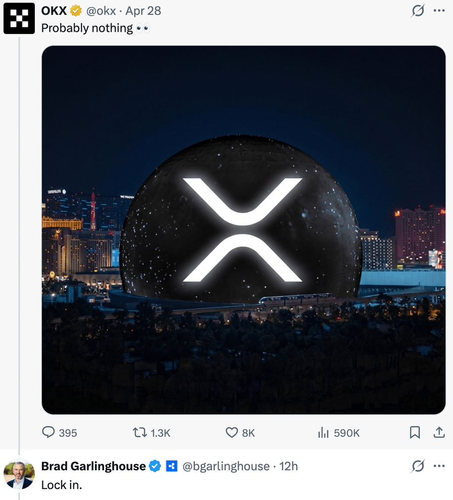 On Tuesday, OKX, a major crypto exchange, posted an image of the Las Vegas Sphere lit with the XRP logo, which Ripple CEO Brad Garlinghouse reposted with a simple directive to his followers: “Lock in.”