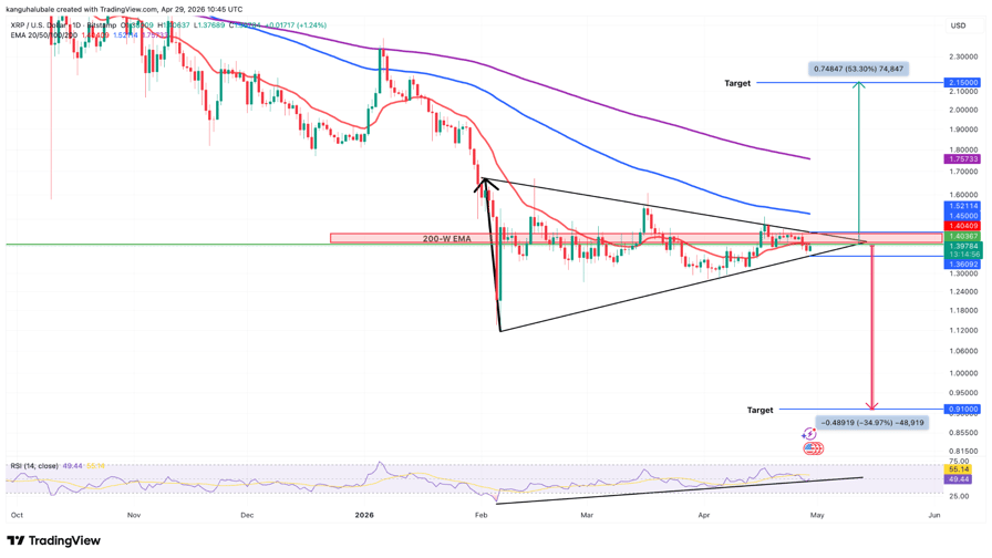 - A symmetrical triangle setup sees XRP price rising roughly 53% as long as support at $1.40 holds.