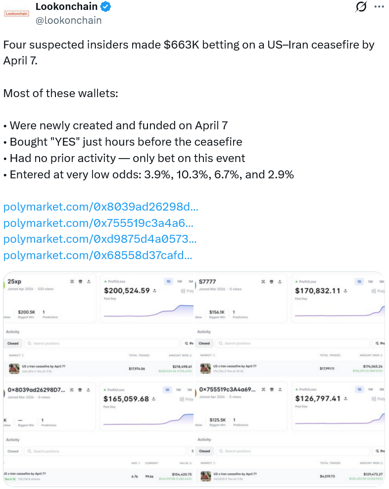 The wallets were created and funded on Tuesday and had no prior onchain activity before betting on Polymarket’s “US x Iran ceasefire by April 7” market, blockchain data shared by Lookonchain revealed on Wednesday.