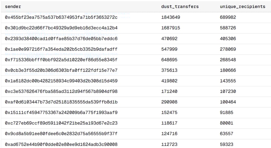 Top contract addresses distributing dust to bait addresses. Source: Andrey Sergeenkov