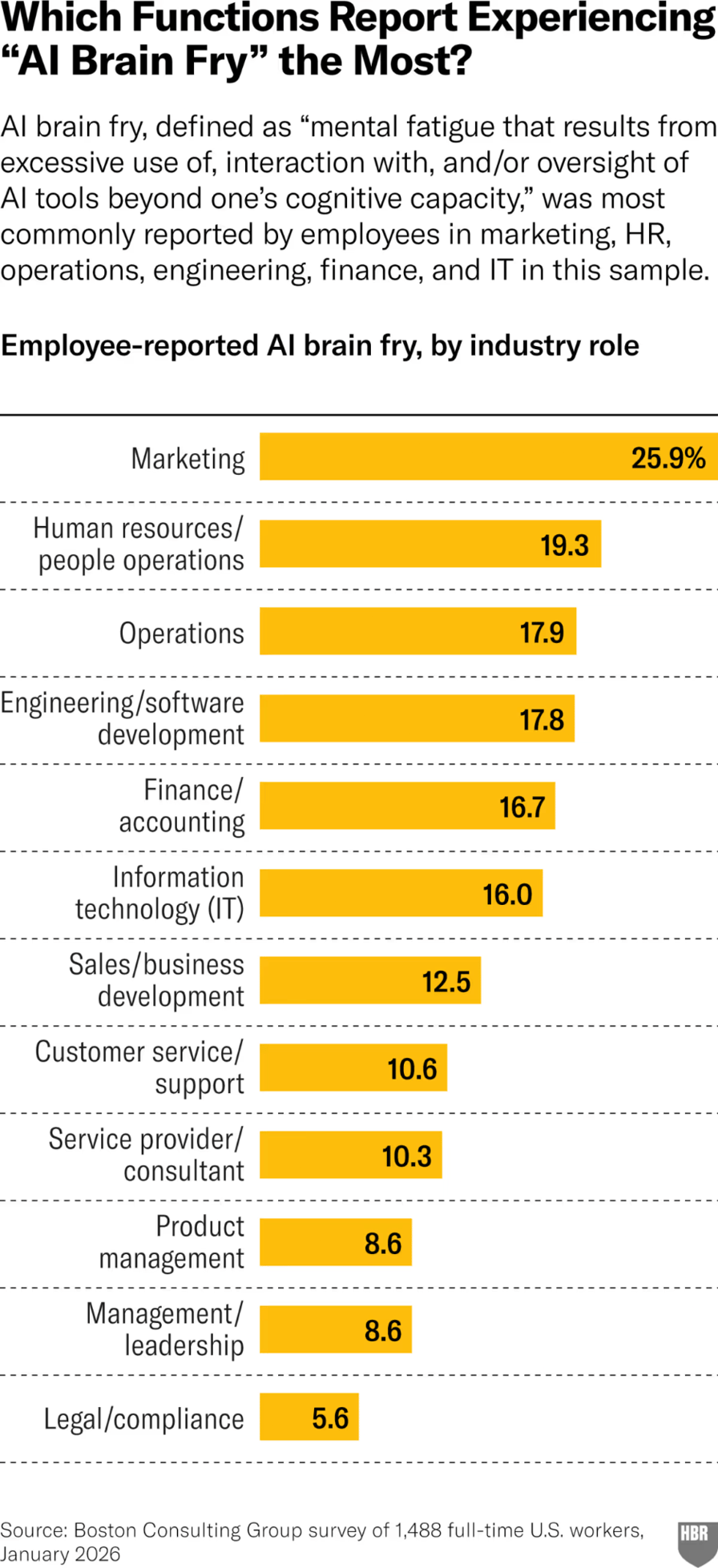 Marketing and HR workers reported the highest levels of AI-induced “brain fry.” Source: Harvard Business Review