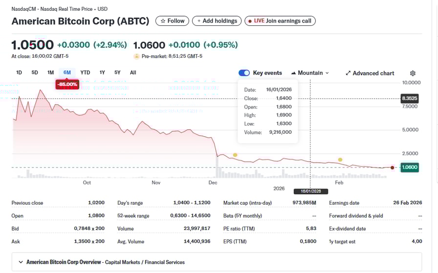 The results come as both Bitcoin miners and Trump‑linked crypto projects come under pressure. American Bitcoin’s combination of a concentrated BTC treasury and sharp equity drawdown makes it one of the more visible stress points in that ecosystem.