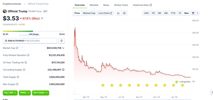 Official Trump coin down 87% from all-time high. Source: Coingecko