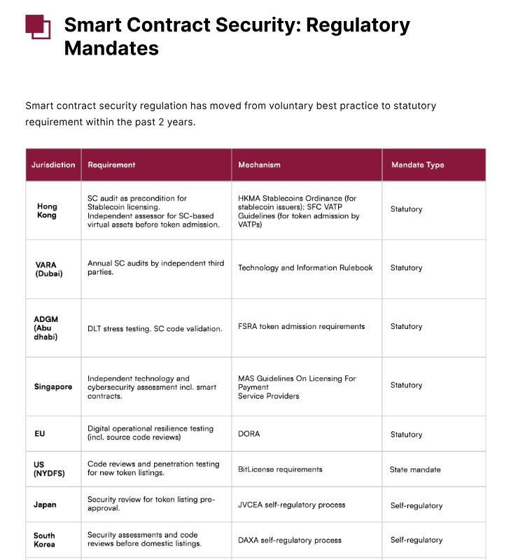CertiK said smart contract security assessments are increasingly being folded into licensing and compliance expectations across major markets, with security audits moving from voluntary best practice to statutory or quasi-statutory requirement across major jurisdictions within two years.