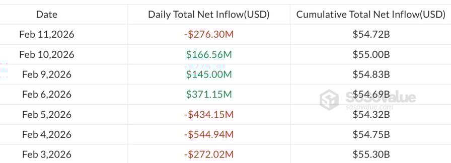 According to SoSoValue data, Bitcoin ETFs recorded $276.3 million in net outflows on Wednesday, nearly wiping out weekly gains, which now stand at just $35.3 million. Total assets under management declined to $85.7 billion, the lowest level since early November 2024.