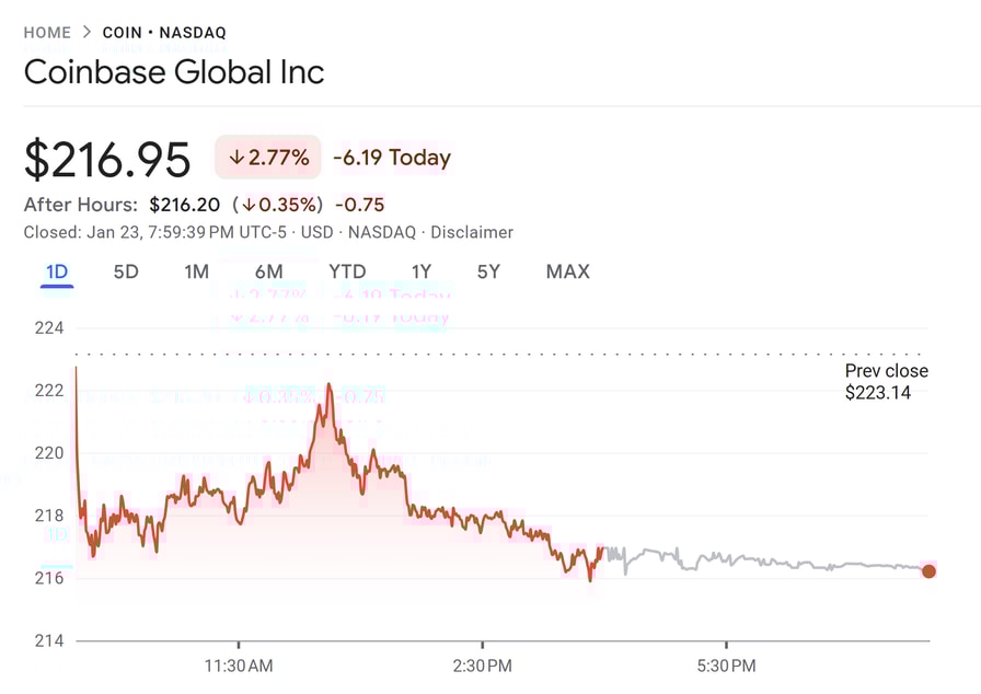 Coinbase shares dropped 2% on Friday. Source: Google Finance