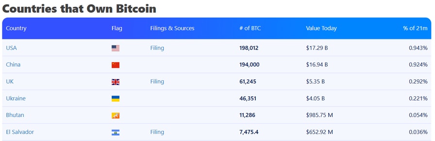 The US is leading the pack among countries holding Bitcoin, while Bhutan is fifth. Source: Bitbo