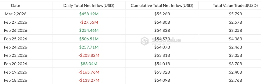 Spot Bitcoin ETFs see $458M in inflows as Mideast conflict widens
