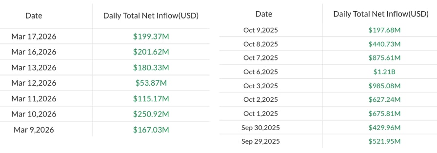 Daily spot Bitcoin ETF inflows from March 9–March 17, 2026, versus Sept. 29–Oct. 9, 2025. Source: SoSoValue