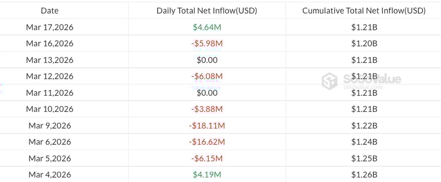 XRP (XRP) stood out with $4.64 million in inflows, the first gains since March 4. The ETFs saw $56.8 million in outflows in the period from March 5-16.