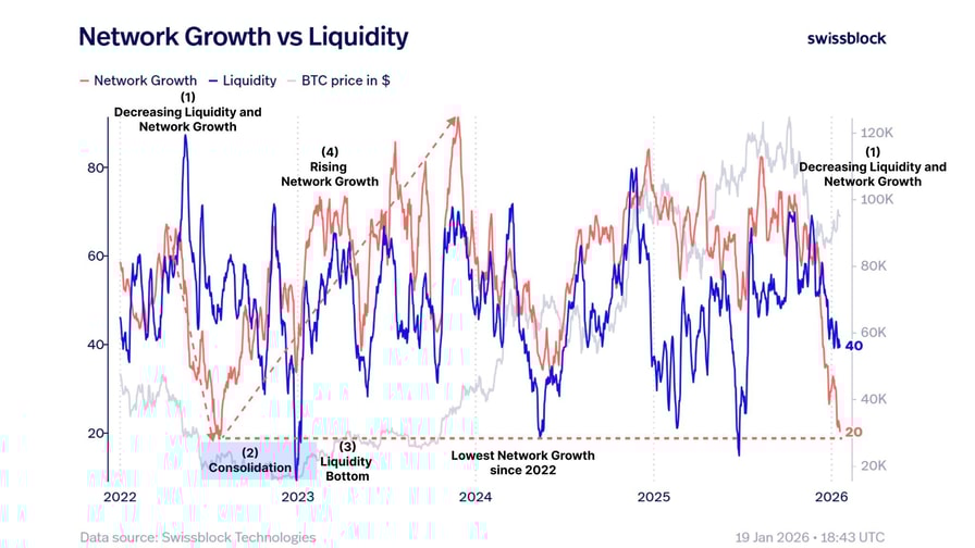 Analysts at Swissblock said the decline in Bitcoin network growth and a recent liquidity drain resemble conditions last seen in 2022.