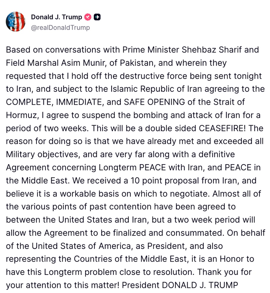 “I agree to suspend the bombing and attack of Iran for a period of two weeks,” US President Donald Trump said in a Truth Social post on Tuesday, hours before his deadline for Iran to reopen the Strait of Hormuz or face military attacks on key infrastructure.