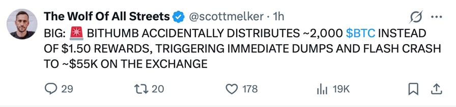 While Bithumb did not disclose the amount involved, several users on X claimed that some accounts were erroneously credited with roughly 2,000 Bitcoin (BTC), a claim that has not been independently verified.