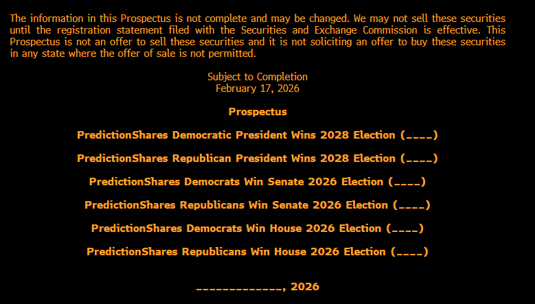 Bitwise filed a prospectus on Tuesday for a new lineup of ETFs branded PredictionShares, comprising six prediction-market-style ETFs listed on NYSE Arca.