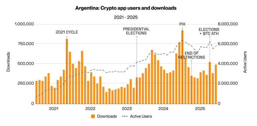 Downloads for crypto applications in Argentina 2021-2025. Source: Lemon