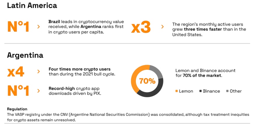 Argentina ranks as the number one country for crypto adoption per capita in LATAM, while Brazil ranks as number one in terms of total crypto value received, according to Lemon’s State of the Crypto Industry in Latin America 2025 report.