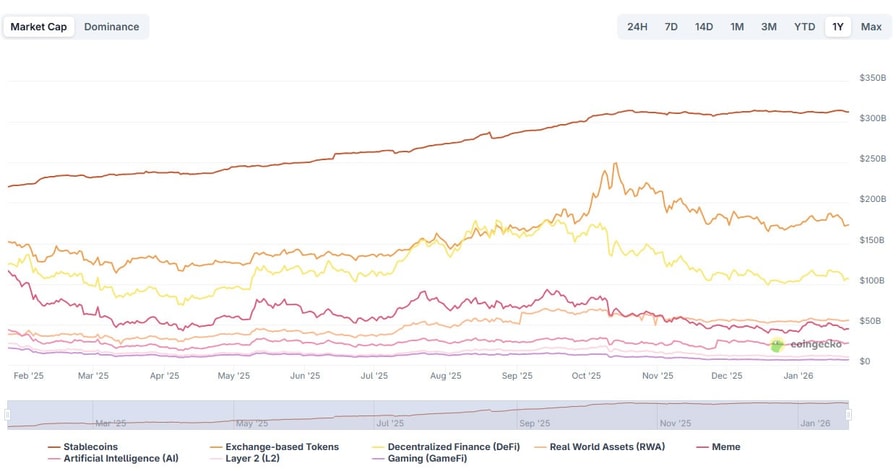 Stablecoins have seen sustained growth while other crypto sectors have declined. Source: CoinGecko