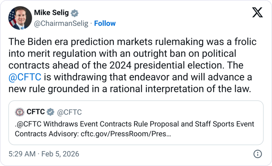 The recently confirmed CFTC chair, Mike Selig, said on Wednesday that the agency has withdrawn a 2024 notice of proposed rulemaking that sought to ban event contracts for sports, politics and war, among other topics, classifying them as “contrary to the public interest.”