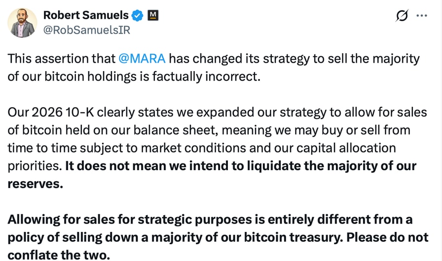 However, MARA vice president of investor relations Robert Samuels dismissed the speculation in a post on X on Tuesday, saying the company has not changed its core treasury strategy.