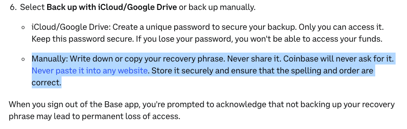 In another guide, Coinbase strongly advised users to never paste seed phrases into any website.