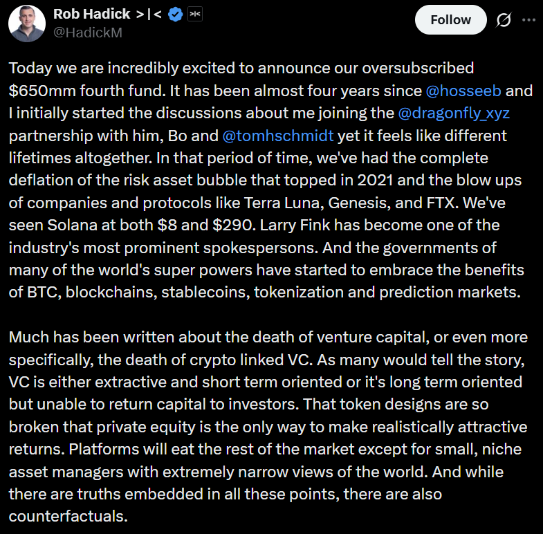 Despite a broader shake-up in crypto venture capital, Dragonfly Capital has closed its fourth fund at $650 million, signaling continued institutional appetite for blockchain infrastructure plays.