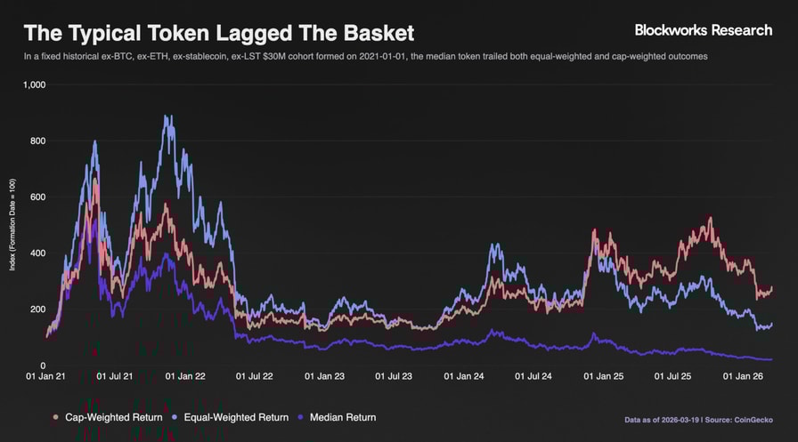 Median token returns have also deteriorated sharply. Most tokens are down roughly 80% from their highs, suggesting that gains have been concentrated in a narrow set of large-cap assets, while the broader market underperforms, Ippolito claimed.