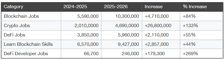 This has also been reflected in Google search statistics, said 1inch, showing that Google search volume for “Blockchain jobs” grew 84% between 2024 and 2026.