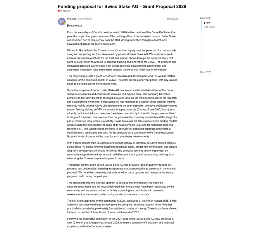That earlier Curve DAO matter concerned a 2025 governance proposal to provide Swiss Stake AG, the main developer behind the Curve Finance protocol, with a grant valued at about $6.8 million, which drew significant pushback from members of the Curve DAO.