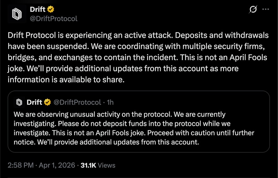 In a subsequent update, the Drift team announced that deposits and withdrawals on the platform have been suspended.