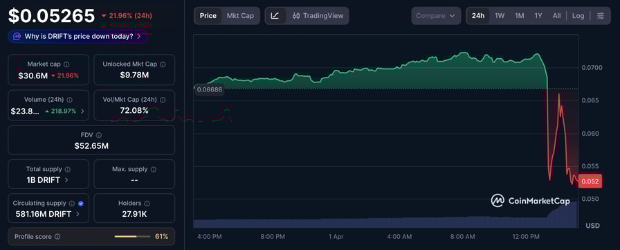 Drift token falls after news of the exploit. Source: CoinMarketCap