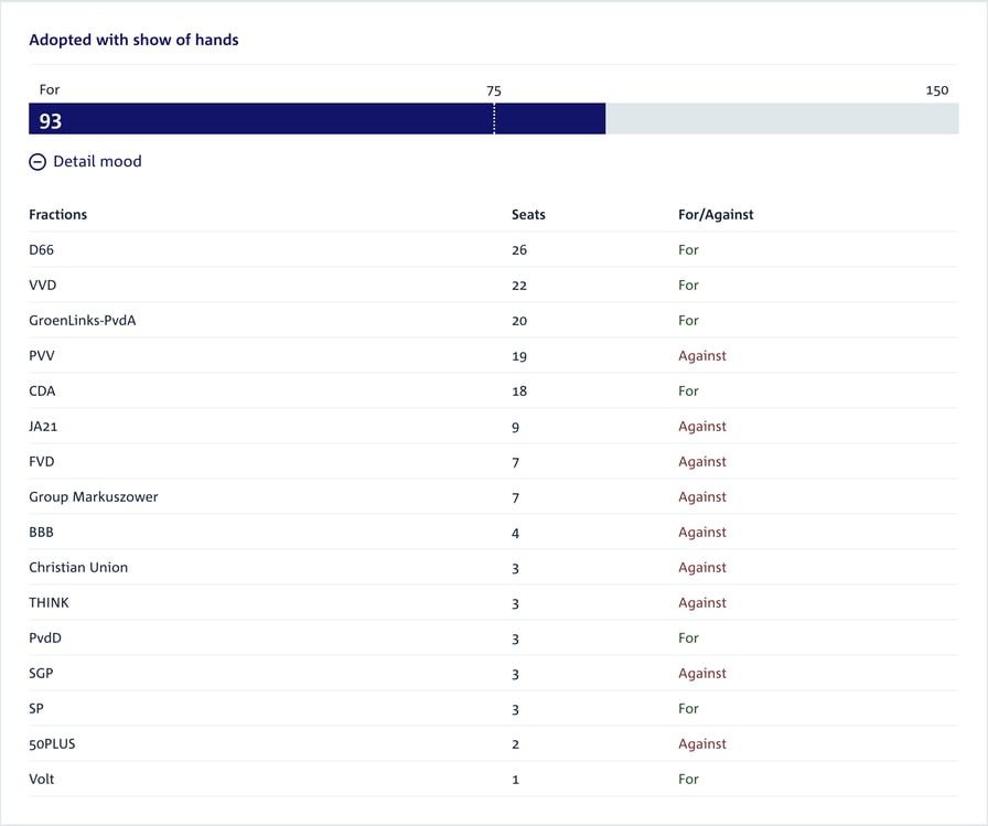 The vote tally for the 36% capital gains tax bill. Source: Dutch House of Representatives