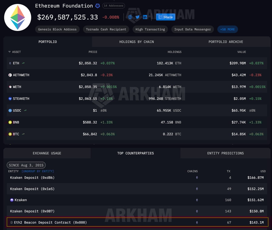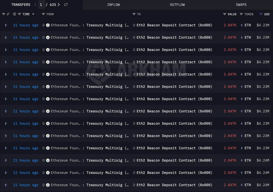 A portion of the ETH transfers from the Ethereum Foundation’s treasury to the Ethereum Beacon Deposit Contract for staking. Source: Arkham Intelligence