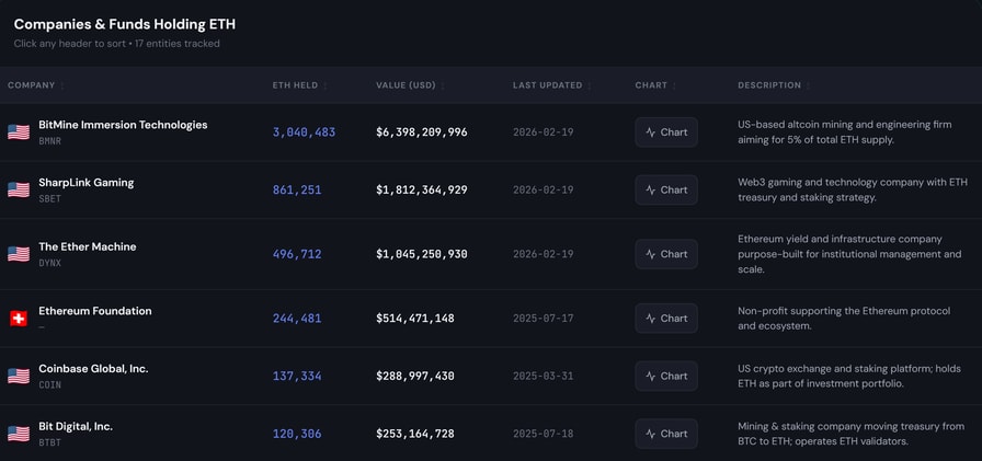 Top 6 Ether treasury firms. Source: Ethereum Treasuries