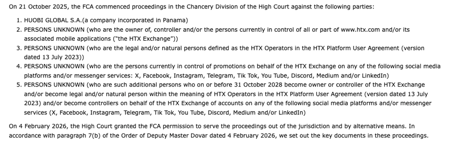 The UK Financial Conduct Authority (FCA) said it began proceedings against HTX and several related persons in the Chancery Division of the High Court in October 2025.