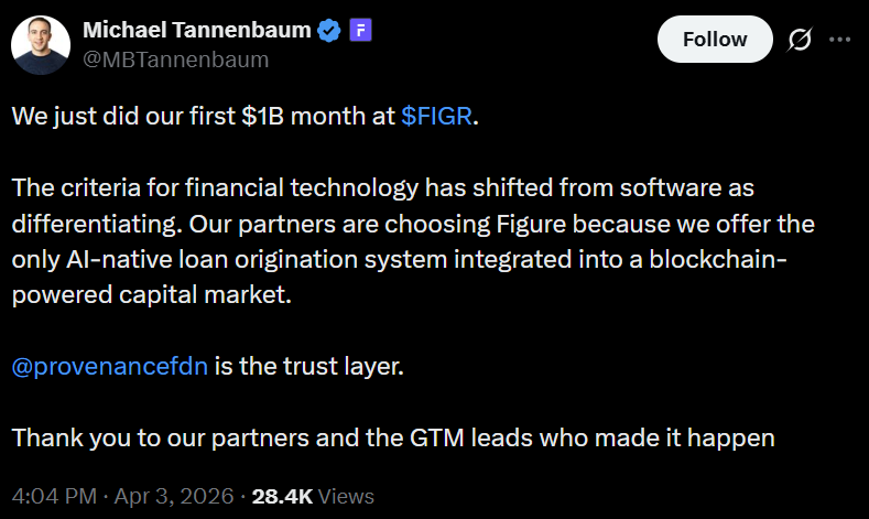 Figure Technology is a fintech company that uses blockchain to originate and manage consumer loans, including home equity products. CEO Michael Tannenbaum recently revealed that the company processed more than $1 billion in monthly volume for the first time.
