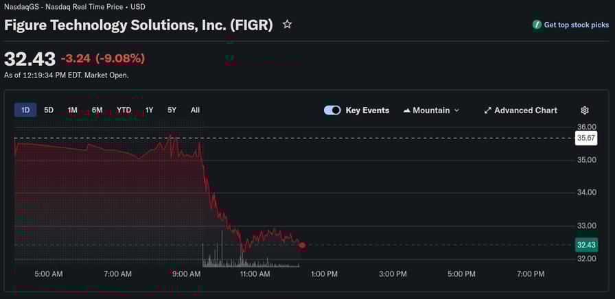 FIGR stock fell more than 9% in early Thursday trading, slipping back to the mid-$32 range after climbing near $37 earlier in the week. The earlier gains were driven by momentum in crypto-related equities and growing investor interest in companies tied to blockchain-based lending.