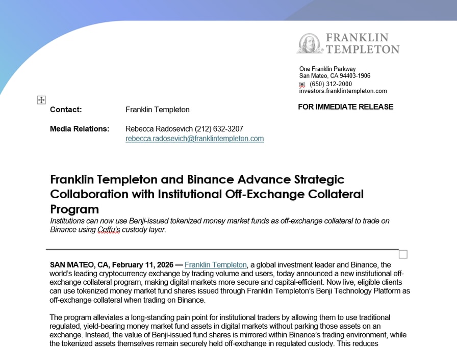 Global investment manager Franklin Templeton announced the launch of an institutional off‑exchange collateral program with Binance that lets clients use tokenized money market fund (MMF) shares to back trading activity while the underlying assets remain in regulated custody.