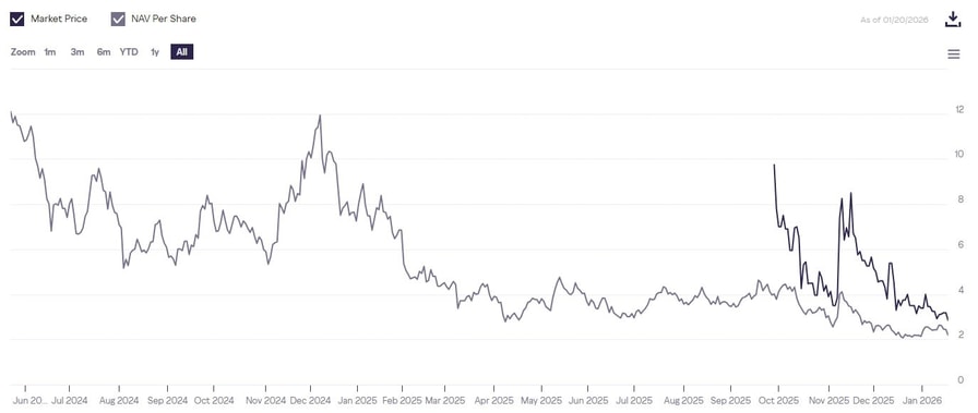 In its current form, it has $900,000 in assets under management. It has a net asset value per share of $2.19, down 45% from when it started trading as altcoin markets have tanked over the past four months.