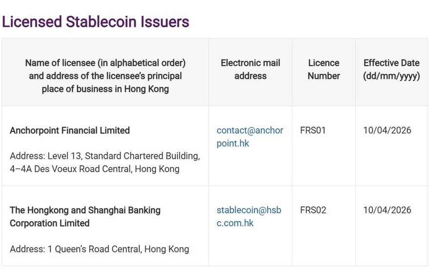 Hong Kong has issued its first stablecoin issuer licenses, approving Anchorpoint Financial and HSBC’s Hong Kong banking arm under its new regime.