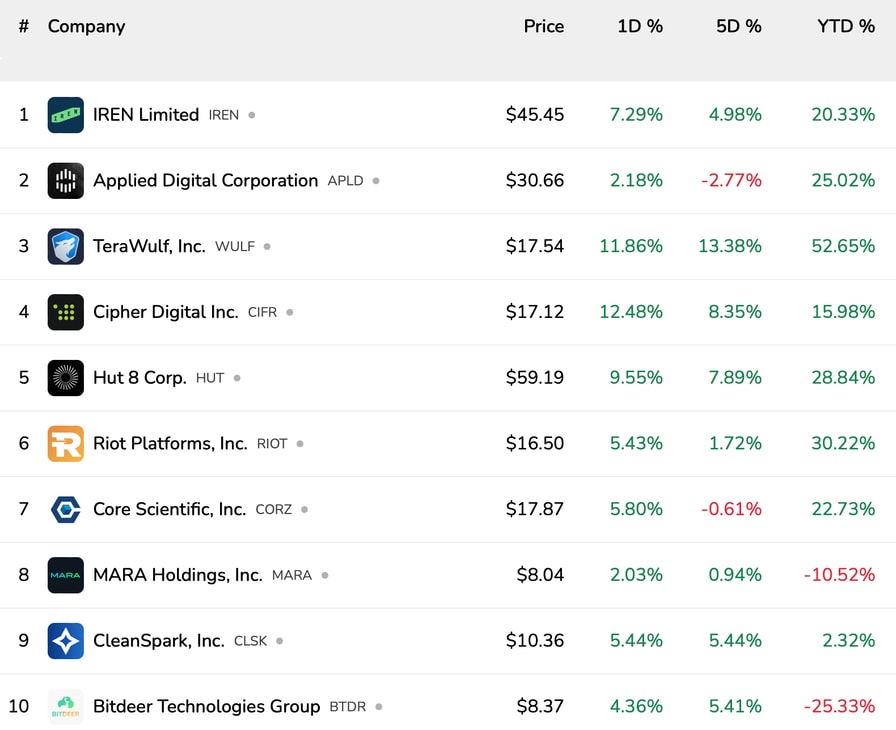 TeraWulf is up more than 50% this year, while Riot Platforms and Hut 8 have advanced about 30% and 29%, respectively, according to data from BitcoinMiningStock.io.