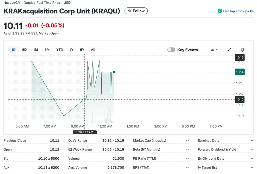 KRAKacquisition was formed as a SPAC, also known as a blank-check company, which is a publicly listed entity with no operating business that raises capital through an initial public offering (IPO) to pursue a future merger or acquisition.